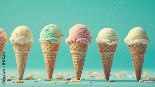 An array of ice cream cones in different flavors lined up in a row on a blue background