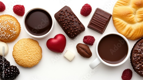 An array of tempting sweets including chocolate, cookies, and fresh berries accompanied by cups of rich coffee, Ideal for food bloggers, culinary promotions, or dessert advertisements,