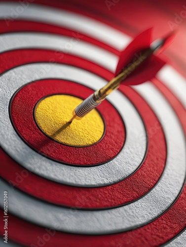 An arrow hits the yellow center of a red and white target. Concept of accuracy, success, and goal achievement, perfect for business.