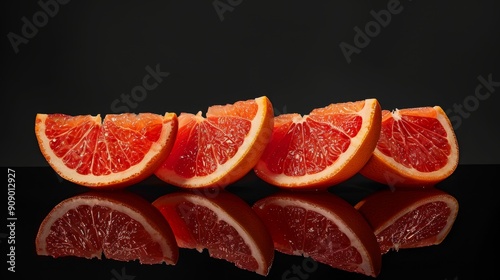An artistic arrangement of grapefruits with sections fanned out, the inner flesh sparkling, set on a glossy black surface for contrast