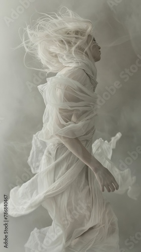 An artistic image capturing a woman mid-movement, her form surrounded by delicate, billowing fabric that adds a sense of ethereal beauty and dynamism