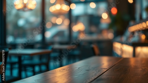 An artistic image featuring warm creative light art. The empty wooden table in a restaurant has an abstract bokeh background. The lighting creates abstract patterns