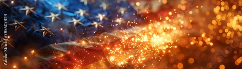 An artistic rendering of the American flag with a glowing golden light shining from the stars and stripes.