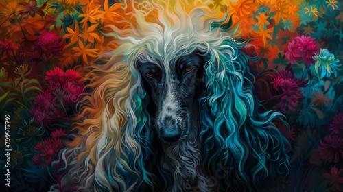 An artistic rendition of a dog with multicolored fur in a lively, abstract floral background