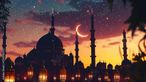 An artistic representation of a mosque at night with the stars and minarets silhouetted against a twilight sky, highlighting its grandeur and the spirituality it represents.