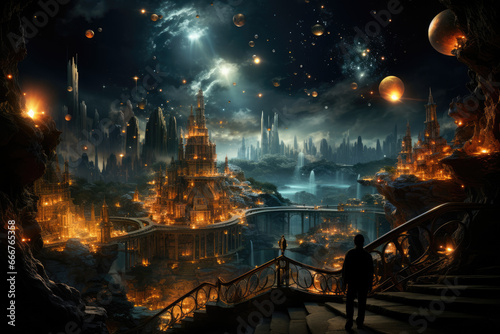 An artistic representation of the multiverse as a vast cosmic library, each book containing the story of a unique universe. Generative Ai.