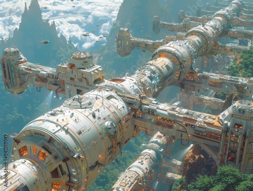 An artist's depiction of a bustling space station with various advanced technologies and alien species interacting.