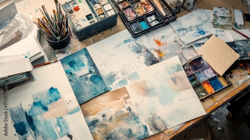 An artists workspace with various types of paper, including sketchpads, watercolor paper, and drafting sheets, scattered around.