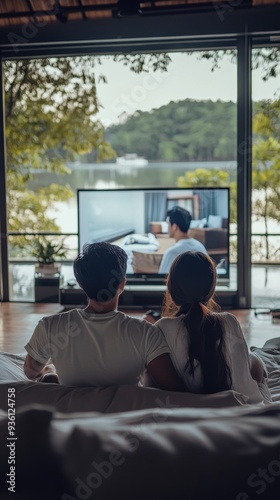 An Asian couple leisurely relaxes together at home, streaming their favorite series on a large TV in a serene setting