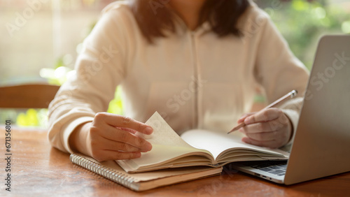 An Asian female student holding a pencil and writing in a book while studying an online class.
