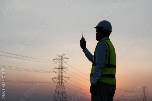 An Asian male engineer using a radio station is working in front of a high voltage pole. In the sunset the sky is beautiful