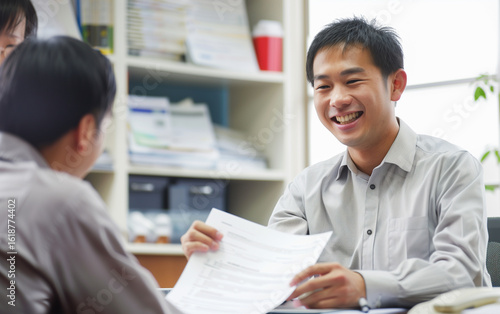 An asian man handing over his resume to a contract sitting at a desk in an office smile