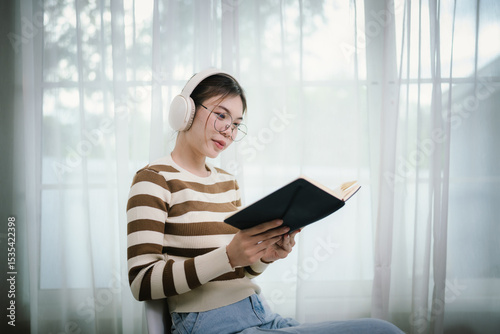 An Asian woman wearing headphones and glasses is sitting by the window reading a book.