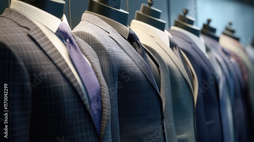 An assortment of business suits on hangers in a retail environment.