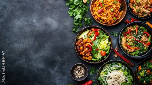 An assortment of East Asian stir-fry dishes, top view with ample copy space available.