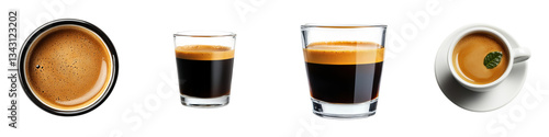 An assortment of espresso based coffee drinks including a classic cup of espresso a glass of espresso and a cup of creamy frothy espresso based coffee