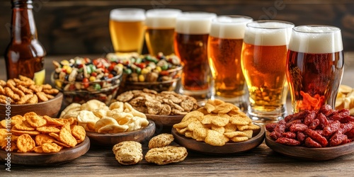 An assortment of snacks perfectly paired with light beer, featuring a colorful display of tasty options ideal for enjoying alongside a refreshing glass of light beer.
