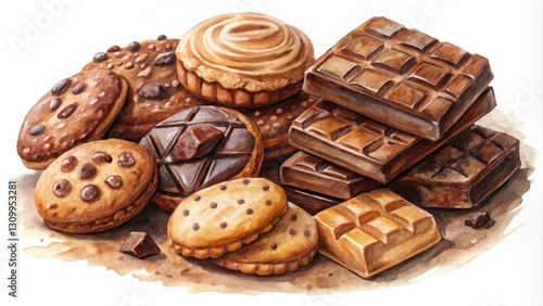 An assortment of sweet treats featuring cookies and chocolate bars, painted with a watercolor technique
