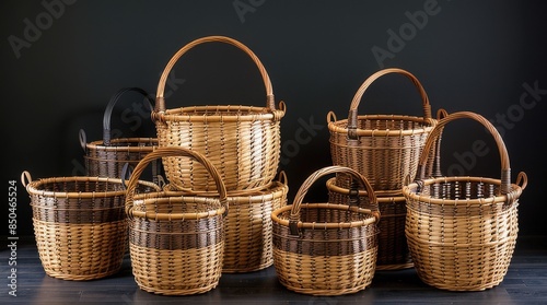 An assortment of wicker baskets with handles arranged on a dark background, showcasing rustic charm and craftsmanship.
