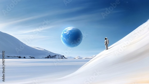 An astronaut standing on an icy planet