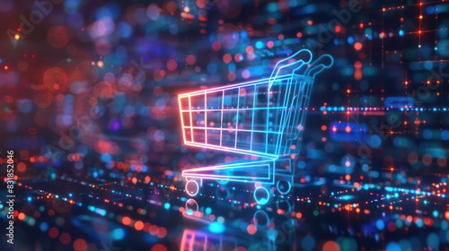 An atmospheric CGI image of a holographic shopping cart icon set against a backdrop of digital grids and patterns, representing the interconnected nature of online shopping platforms in the future.