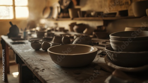 An atmospheric pottery studio with pottery wheels and clay tools, Ceramic art creation style, photo of