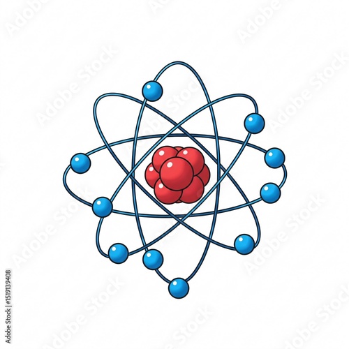 An atom model featuring three blue electrons orbiting a yellow nucleus,