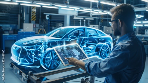 An automotive engineer using an iPad with augmented reality software to analyze and improve 3D car models. Futuristic Facility: Virtual Design with Mixed Technology.