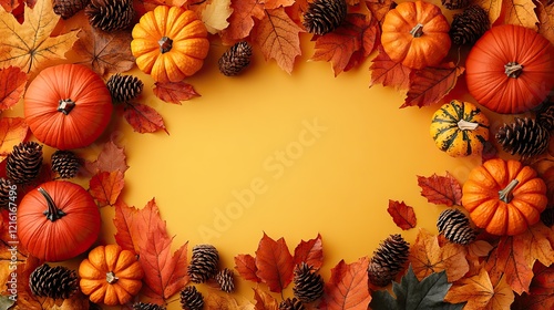 An autumn composition featuring various pumpkins, dried leaves, and pine cones artfully arranged on a bright yellow background