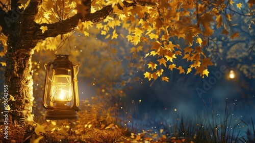 An autumn night scene with a lantern's glow highlighting the yellow leaves of a tree, creating a peaceful and cozy ambiance --ar 16:9 Job ID: d5938ccd-256d-472a-8d7d-7b189f6656a2