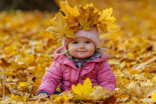 An autumn park scene shows a little kid playing and sitting in fallen leaves. Baby is in a huge wreath of leaves. A girl is dressed in a warm hat and jacket.