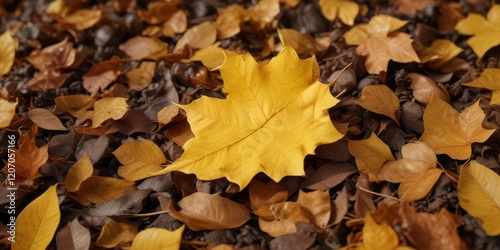An autumn yellow leaf rests on a bed of golden brown leaves, its delicate shape and color a striking contrast to the earthy tones around it , earthy tone , nature