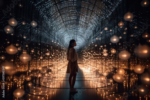 An awe-inspiring photo of an individual strolling amidst a striking light exhibit, encapsulating the amazement and marvel of interactive artwork. Generative AI