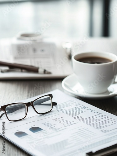 An editorial photograph showing a close-up of a financial planner's desk with a focus on a detailed risk management report, highlighters, and a cup of coffee, representing the meticulous process