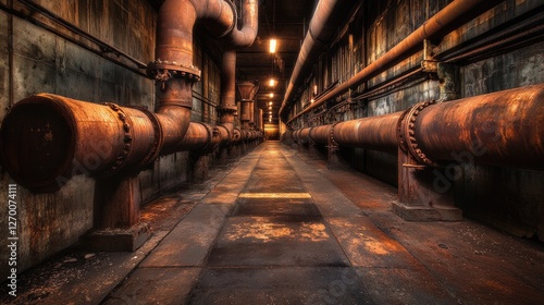 An eerie, abandoned tunnel with rusted pipes running along the walls and dim lighting, casting an unsettling and industrial vibe.