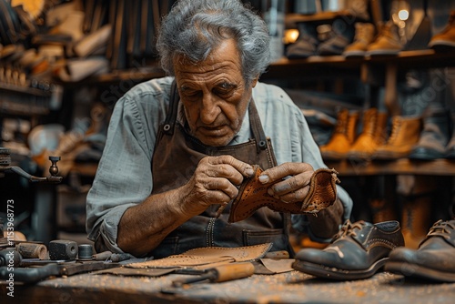 An elderly artisan meticulously stitches leather in his workshop, surrounded by various tools and shoes. The warm lighting adds character to the space as he focuses intently on his craft