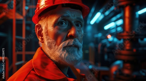 An elderly man in a work uniform and helmet in the subway tunnels or under the city. A caretaker of the city's pipes and communications. Horizontal format.