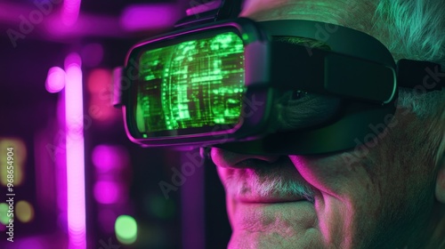 An elderly man with a smile on his face looks through a VR headset as he explores the digital world.