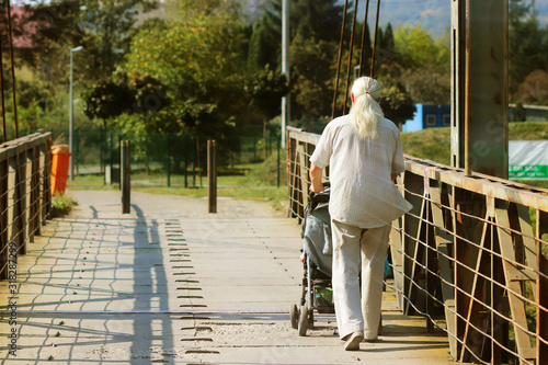 An elderly man with long, gray, athletic build hair walks with a child in a pram over a bridge. Activity in old age. Lessons for grandparents to care for children. Joyful old age with grandchildren