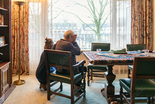 An elderly person sitting at a dining table in a cozy room, gazing out of a large window with a child playing nearby.