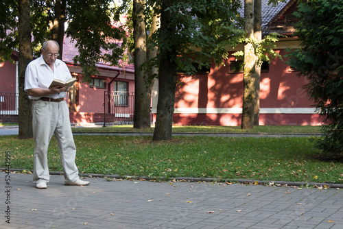 An elderly retired man walks alone in the park. An old, balding man with glasses stands against the background of a red building and reads a book