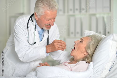 An elderly woman in the hospital with a doctor