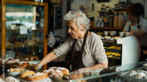An elderly woman with gray hair and an apron is thoughtfully arranging baked goods in a cozy bakery, illuminated by soft sunlight.