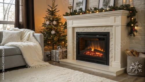 An electric fireplace in a room with winter decor that creates a warm atmosphere