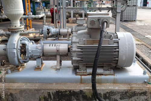 an electric motor-driven centrifugal pump that is put in an oil refinery or chemical factory. Industrial and technological work concept to transmit liquids to various production units of enterprises.