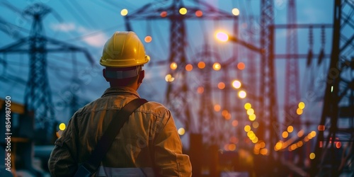 an electrical engineer in a reflective vest, holding a flashlight and inspecting cables, construction site lit up for night work, summer night