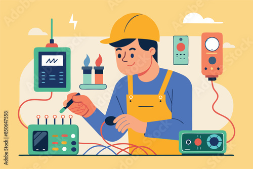 An electrician in a helmet and overalls is working on an electronic device with a soldering iron. Various electronic components and devices can be seen around, the topic of designing and repairing ele