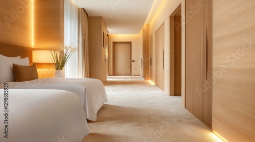 An elegant bedroom showcasing modern design elements and soft lighting, providing a serene and cozy atmosphere for relaxation and tranquility.