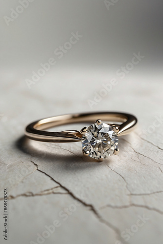 an elegant diamond engagement ring with a prominent solitaire, set on a slender gold band. The textured grey background adds a touch of sophistication
