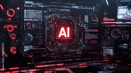 An elegant digital interface with "AI" in the center and futuristic designs surrounding